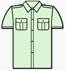 เสื้อพนักงานแขนสั้น คอเชิ๊ต สาปนอก กระเป๋าที่อก 2 ใบ มีฝาปิด อินธนูที่บ่า เอวปล่อย ชายเสมอ |